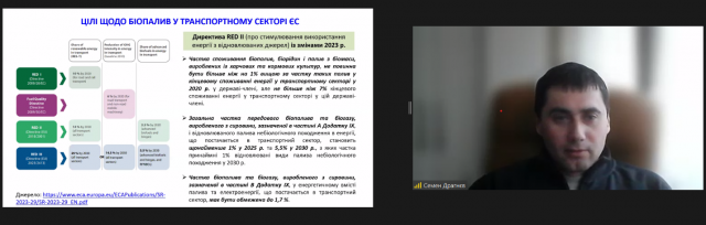 Старший науковий співробітник Інституту технічної теплофізики НАНУ, старший консультант НТЦ «Біомаса», експерт UABIO, к.т.н. Семен Драгнев, в минулому студент НУБіП України за спеціальністю «Механізація сільського господарства», консультує щодо процесів збору, логістики та енергетичного використання аграрної біомаси; виробництва біодизелю. Експерт представив ґрунтовну презентацію, розповів про особливості біопалива у транспортному секторі ЄС.