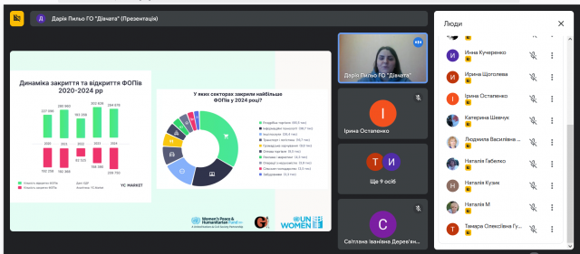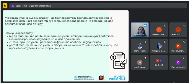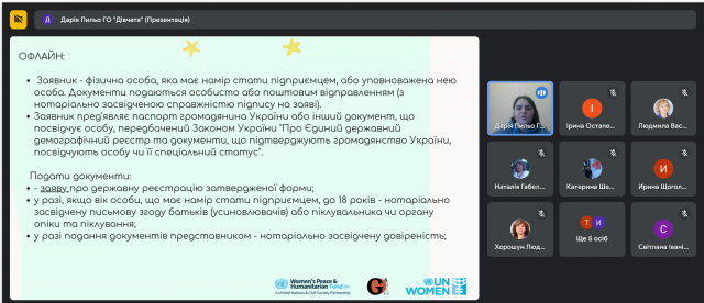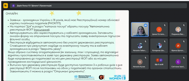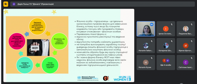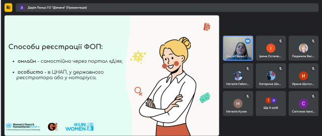 Інформаційну сесію «Заснування власної справи, порядок та процедура реєстрації фізичної особи-підприємства (ФОП)» провела Дарія Пильо. Акцентовано увагу на державній політиці щодо розвитку підприємництва в Україні, умовах реєстрації ФОП для ВПО, умовах одержання мікрогрантів на розвиток власної справи.
