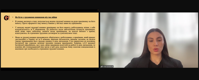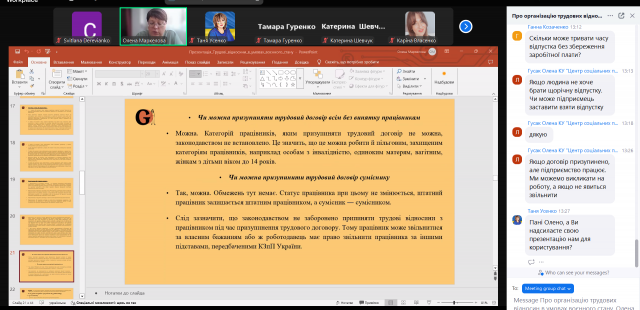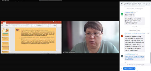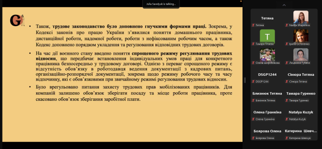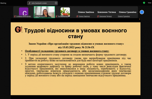Адвокатка, юристка з багаторічним досвідом Олена Меркелова провела інформаційну сесію «Про організацію трудових відносин в умовах воєнного стану». Присутні на сесії мали можливість отримати відповіді на актуальні питання щодо роботи у нічний час, особливостях надання основних та додаткових відпусток, організації трудових відносин із сумісниками, призупинення трудового договору тощо.