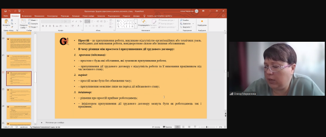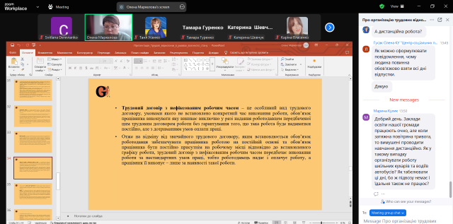 Лектор наголосила на основних змінах трудових відносин в умовах воєнного стану, особливостях укладання трудового договору, змінах істотних умов праці, випадках розірвання або призупинення трудового договору з ініціативи працівника чи роботодавця. Значна увага була приділена правилам встановлення та обліку часу роботи та часу відпочинку, обов’язку вчасної виплати заробітної плати працівникам, умовам відшкодування працівникам та роботодавцям пов’язаних із трудовими відносинами грошових сум, втрачених внаслідок збройної агресії проти України. Значна увага була приділена питанню особливостей обміну документами, організації кадрового діловодства та архівного зберігання кадрових документів у роботодавця.