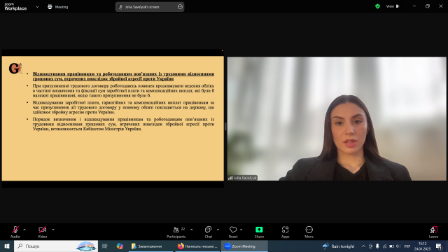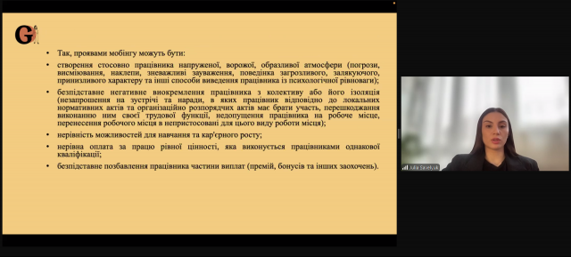 Лектором інформаційної сесії «Трудові відносини під час воєнного стану» виступила адвокат Юлія Савелюк. Було акцентовано увагу присутніх на змінах вітчизняного законодавства, яке регулює трудові відносини під час воєнного стану. Значна увага була приділена випадкам мобінгу на роботі, або ж цькування працівника з боку його колег, підлеглих або керівництва, яке вчиняється з метою приниження гідності співробітника. Донедавна це питання замовчувалося та не виносилося на публіку, але 1 грудня 2022 року Верховна Рада України прийняла закон № 5749 про мобінг, який передбачає відповідальність за цькування і приниження на роботі. Юлія Савелюк зупинилась на причинах його виникнення та механізмі захисту від цього деструктивного явища.
