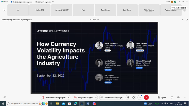 22 вересня 2022 аналітики та експерти Tridge провели Міжнародну онлайн конференцію на актуальну тему для сільського господарства: «Як валютні курси вплинули на торгівлю сільськогосподарською продукцією». До участі в конференції долучилися викладачі кафедри статистики та економічного аналізу доценти: Богданюк О.В., Воляк Л.Р., Куць Т.В., Макарчук О.Г.