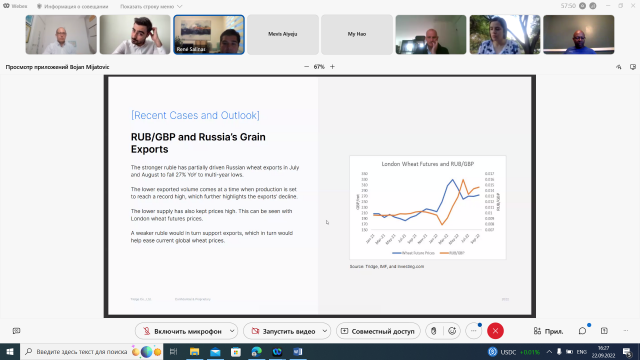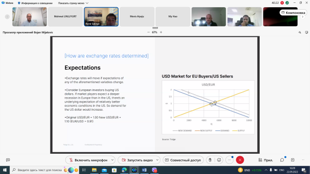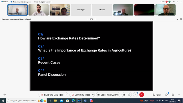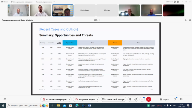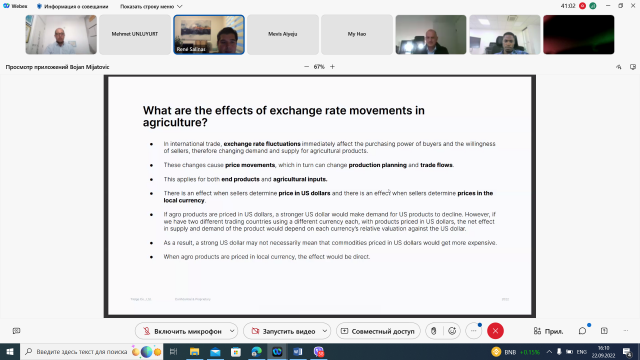 Під час зустрічі були обговорені питання залаежності валютного курсу та обсягів торгівлі, а також як нестабільність валют вплинула на основні країни-експортери та імпортери, такі як США, ЄС, Туреччина, Китай, Японія, Бразилія тощо. Були також проаналізовані можливості і загрози країн в зовнішній торгівлі сільськогосподарською продукцією, окремі питання були адресовані нестабільності в Україні через військові дії росії.