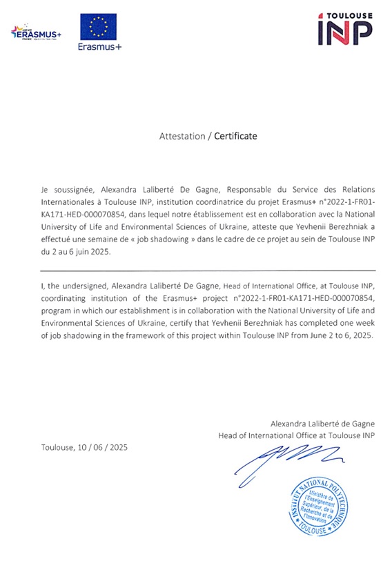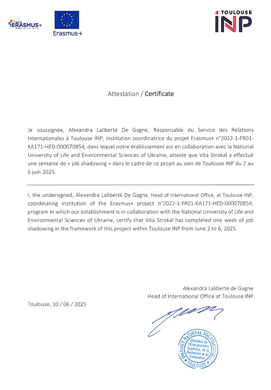 У рамках академічного обміну між вищими навчальними закладами Європи відповідно до програми Erasmus + з 2 до 6 червня в політехнічному інституті міста Тулузи (Франція) побували викладачі кафедри екології агросфери та екологічного контролю, доценти Віта СТРОКАЛЬ та Євгеній БЕРЕЖНЯК. Слід відмітити, що у структурних підрозділах Національного політехнічного інституту, зокрема NP-AgroToulouse — інженерний факультет наук про життя, INP-ENSIACET — вища школа хімічної, матеріалознавчої та промислової інженерії, ENSEEIHT — національний інститут електротехніки, електроніки, інформатики, механіки рідин та телекомунікацій і мереж велику увагу приділяють сучасним екологічним програмам, мета яких полягає у розробленні та впровадженні важливих ефективних рішень щодо зменшення антропогенного навантаження на навколишнє середовище.