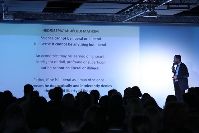 Довгоочікуваною подією заходу був publik-tаlk з професором Еріком Райнертом, засновником фонду «Інший канон», автором бестселеру «Як багаті країни забагатіли і чому бідні залишаються бідними». Пан Ерік Райнерт надзвичайно цікава особистість, у його домашній бібліотеці налічується близько 40 тис. книг, він не працює на Світовий Банк та на уряди країн світу, що робить його вільним науковцем, який має право виголошувати думки у розріз із світовими заангажованими тенденціями. У мене особисто склалася думка, що це закоренілий оптиміст, який із будь-якої ситуації бачить вигоду. Він стверджує, що у світі немає вільного ринку та підтримує дії президент США Дональда Трампа, який перший відважився зупинити «лицемірний» вільний ринок. Сучасну економічно ситуацію в Україні він порівнює із проблемами у США, які були вирішені свого часу планом Маршала. На переконання вченого, Україна поряд із такими країнами як Італія, Португалія та Греція перебуває у «борговому рабстві». Він привернув увагу учасників на такому явищі як «парадокс збереження», який полягає в тому, що коли є великі заборгованості, то найгірше, що можна роботи – це економити. Щодо корупції, то Ерік Райнерт переконаний, що це вікова тінь феодалізму, міцно закрпілена комунізмом. Головним шляхом боротьби з корупцією та міграцією має стати індустралізація України.