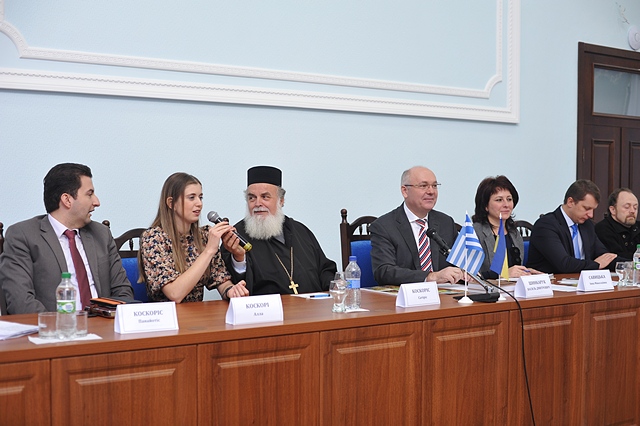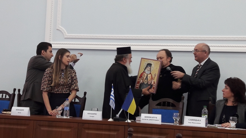 Відкрив зібрання декан гуманітарно-педагогічного факультету професор Василь Шинкарук, котрий представив добрих друзів університету, які протягом кількох років беруть участь у проекті, – голову спілки греко-сербсько-української дружби трьох святителів та Кирила й Мефодія ієрея Сатіріса Коскоріса (м.Егіна, Греція), заступника голови спілки греко-сербсько-української дружби богослова, протопсалта Панайотіса Коскоріса, філолога-перекладача Аллу Коскорі, кандидата культурології, старшого викладача НТУ України «Київський політехнічний інститут» Лілію Диніковута відомого українського реставратора-іконописця, чоловіка Л.В.Терещенко-Кайдан Руслана Кайдана. У вступному слові Василь Дмитрович наголосив, що проект «Україна – Греція» був започаткований не в нашому університеті, але добра справа завжди потребує розвою і продовження, і Лілія Володимирівна Терещенко-Кайдан долучила до нього саме наш факультет. Це і довіра, і впевненість у тому, що у стінах НУБіП завжди можна знайти підтримку і допомогу, тому проект буде продовжений. А ще, зазначив декан, проект дасть можливість обміну культурними і науковими здобутками, стажування викладачів і студентів в університетах Греції, публікацій в іноземних виданнях.