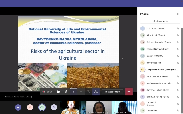 Професор Надія Давиденко представила доповідь на тему: «Ризики в аграрному секторі України». Доповідач розкрила місце аграрного сектору України на світовому аграрному ринку, представила аналіз структури експорту та імпорту сільськогосподарської продукції, динаміку аграрного експорту України та вказала на основні причини її негативної зміни. Вона зазначила, що основними ризиками у період війни для українського аграрного сектору є: окупація українських територій, розрив логістичних ланцюгів всередині країни, так і назовні, зменшення обсягу внутрішнього ринку та зниження купівельної спроможності українського населення, недостатність ресурсів для сільськогосподарського виробництва, проблеми з робочою силою та крадіжки української сільськогосподарської техніки і продукції. Вітчизняний аграрний сектор потребує підтримки як з боку держави, так і з боку іноземних фондів, організацій та держав. Український уряд створив ряд програм підтримки сільськогосподарських товаровиробників у період військових дій. У податковій сфері підтримка відбулася за рахунок зменшення ПДВ, сплати податків для ФОПів 1 і 2 групи за бажанням, сплати державою ЄСВ за мобілізованих працівників, скасування акцизу на нафтопродукти та ін. Підтримка державою аграрного сектору у фінансовій сфері здійснюється за рахунок надання доступу до дешевих кредитів та відкриття нових грантових програм. На державному рівні відбулися також процеси дерегуляції: відміна перевірок бізнесу, впровадження декларативної системи роботи бізнесу, спрощення митних процедур. Важливим для відновлення аграрного сектору є розвиток аграрної освіти і науки, створення стійких логістичних ланцюгів, розвиток малого та середнього бізнесу у регіонах, інтеграція з конкурентоспроможною продукцією у світові ринки, адаптація до клімату, стійке та екологічне сільське господарство, технологічний розвиток та цифровізація аграрного сектору