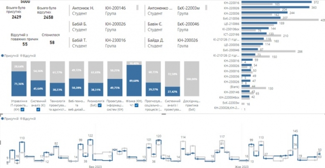 На секції «Інформаційні системи і технології в економіці, техніці та природокористуванні» кожна доповідь була актуальна, обґрунтована та містила апробацію отриманих наукових результатів. Досвідчені колеги плідно провели час у наукових дискусіях. Так, аспірантом кафедри інформаційних систем і технологій Євген Клименко було продемонстровано оцінку навчальних досягнень слухачів курсів (в Moodle) й ефективність процесу викладання. При цьому на основі звіту Attendance activity побудовано модель даних та сформовано дашборди з візуалізацією зрізів відвідуваності за різними ознаками (від конкретної дисципліни та конкретного студента до загальних зведених показників).