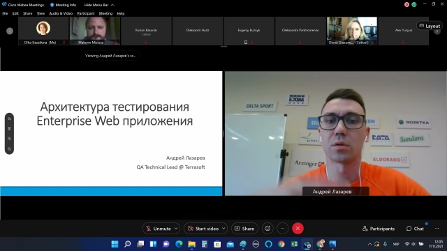 Архітектуру тестування Enterprise Web додатків презентував Лазарєв Андрій, QA Technical Lead компанії Terrasoft, яка відома своїми рішення у напрямі low-code та no-code програмування, розробки BPM і CRM систем, програмними продуктами Creatio. Жваве обговорення презентації, запитання та відверті відповіді спікера отримали надзвичайно багато схвальних відгуків.