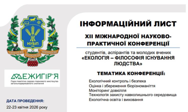 XІІ Міжнародна науково-практична конференція студентів, аспірантів та молодих вчених «ЕКОЛОГІЯ – ФІЛОСОФІЯ ІСНУВАННЯ ЛЮДСТВА» Інформаційний лист_Екологія - філософія_2026 (2).pdf 23 березня - 24 квітня 2026 року 23:53 - 04:53