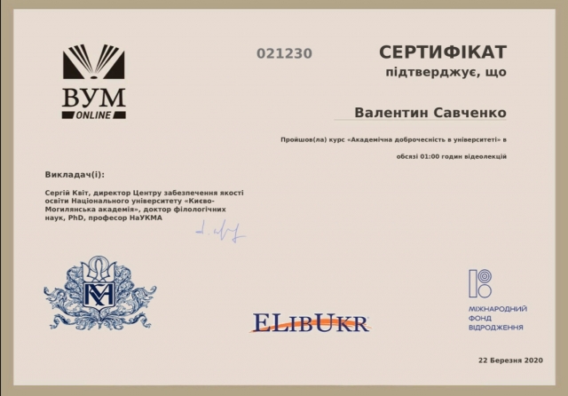 10. Пропагуємо академічну доброчесність серед здобувачів та науково-педагогічних працівників. Так за 2 тижні навчання у дистанційному режимі усі наші здобувачі та частина науково-педагогічних працівників пройшли курс «Академічна доброчесність в університеті» на базі on-line платформи ВУМ (https://vumonline.ua/). Спікерами даного курсу є Сергій Квіт та Світлана Чуканова. Здобувачі та НПП отримали відповідні сертифікати, які засвідчують про успішне проходження курсу.