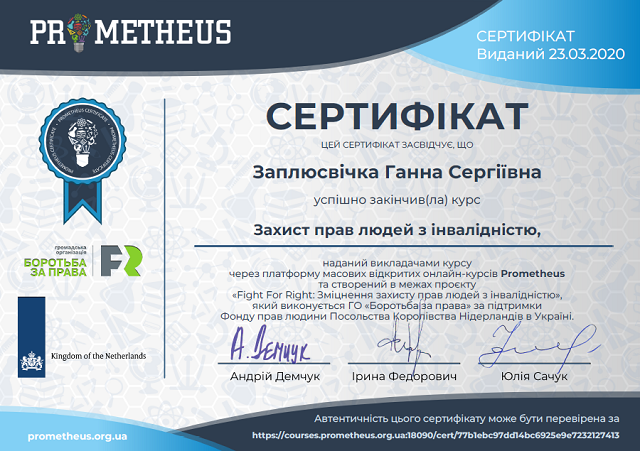7. Мотивуємо здобувачів вищої освіти до професійного вдосконалення через неформальну освіту. Колектив кафедри залучає здобувачів до проходження онлайн-курсів, майстер класів на базі таких платформ як: Prometheus, EdEra, ВУМ ін. Так, наприклад більшість здобувачів освітньо-професійної програми «Соціально-психологічна реабілітація» успішно пройшли курс «Захист прав людей з інвалідністю» (платформа Prometheus), «Соціальний маркетинг» (платформа ВУМ) та отримали відповідні сертифікати.