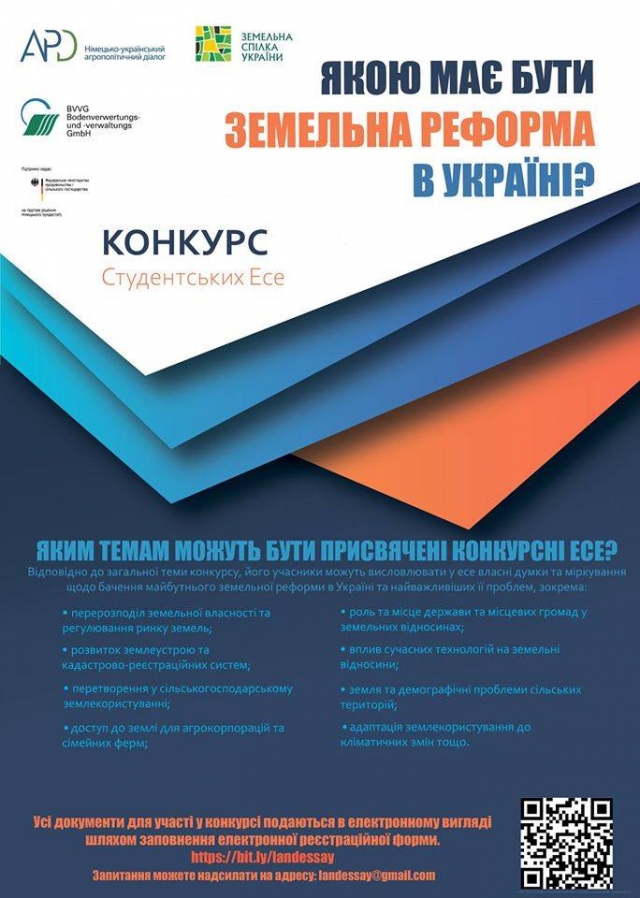 Спільно з партнерами і роботодавцями факультету землевпорядкування – Асоціацією «Земельна спілка України» та АПД Україна/APD Ukraine проведено Конкурс студентських есе на тему «Якою має бути земельна реформа в Україні» для студентів 1-5 курсів спеціальності «Геодезія та землеустрій». Переможці отримали цінні призи.