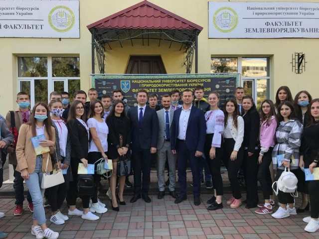 Наші роботодавці із задоволенням беруть участь і в урочистих заходах, що проходять в університеті. Так, 21 вересня 2020 року за участі Голови Держгеокадастру Романа Лещенка та Голови правління ВГО «Асоціація фахівців землеустрою України» Анатолія Полтавця відбулась урочиста посвята 122-ох першокурсників факультету землевпорядкування і вручення їм студентського квитка та залікової книжки.