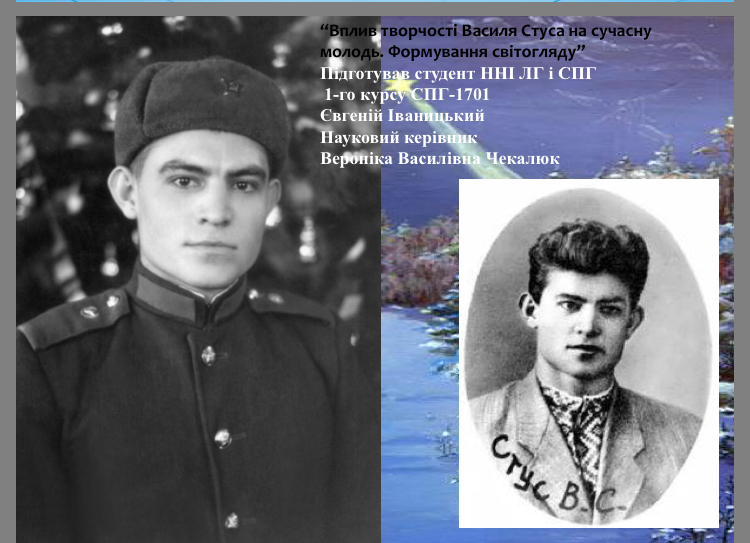 «Зображуючи портрет сучасника, я завжди уявляю молоду людину. Погоджуюсь із тим, що вік вимірюється не роками, а станом душі, проте приклади з життя свідчать, що історію вершать люди молоді. На жаль, життя диктує свої правила, яких, на мою думку, слід вчитися у старших, тим самим продовжуючи зв’язок поколінь. Гарним прикладом для наслідування, для нас усіх, може слугувати життєвий і творчий шлях поета Василя Стуса», - зазначив Є.Іваницький, першокурсник ННІ лісового і садово-паркового господарства.
