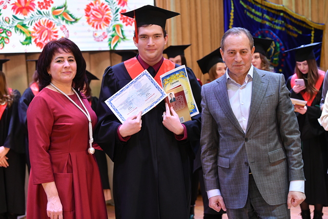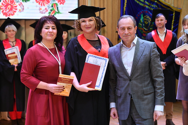 Першими на сцену для отримання дипломів вийшли ті, чиї особливі старання і успіхи в оволодінні знаннями увінчалися отриманням документу про отриману освіту з відзнакою! Із рук ректора університету Станіслава Ніколаєнка та голови наглядової ради університету вони отримали не тільки диплом з відзнакою (червоний!), а й приємний подарунок – книгу Миколи Томенка «Україна: Історія Конституції».