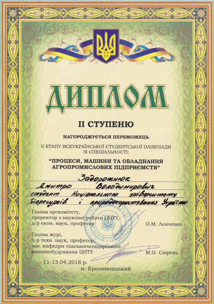 Задорожнюк Дмитро - срібний призер олімпіади зі спеціальності "Процеси, машини та обладнання агропромислових підприємств"