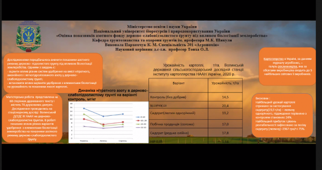 Чіткою, змістовною та динамічною була доповідь Катерини Пархомчук, керівник Оксана Тонха на тему оцінки показників азотного фонду дерново-слабопідзолистого грунту під впливом біологізації землеробства.
