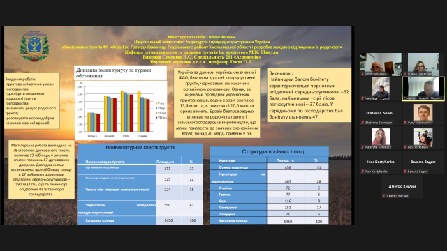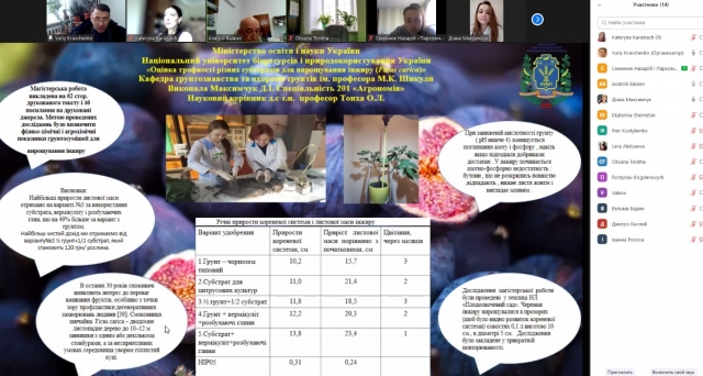 Онлайн захід відбувся у насиченій, багатій питаннями та побажаннями, проте доброзичливій атмосфері. Слід відзначити активну участь членів кафедри в обговоренні постерних презентацій. Оксана Леонідівна звернула особливу увагу магістрів на виробничі питання раціонального використання ґрунтів, давала поради щодо покращення їх робіт, спрямовувала на подальшу професійну діяльність. Юрій Станіславович звертав особливу увагу на методику досліджень, Анатолій Джалілович – на практичному використанні результатів досліджень.