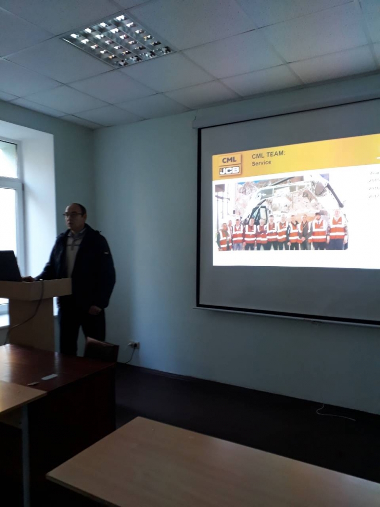 Олександр Кучер ознайомив студентів і викладачів кафедри із структурною політикою сервісу компанії CML (представника JCB). Описав принцип роботи та надав коротку технічну характеристику про можливості кожного представленого на презентацій технічного обладнання.