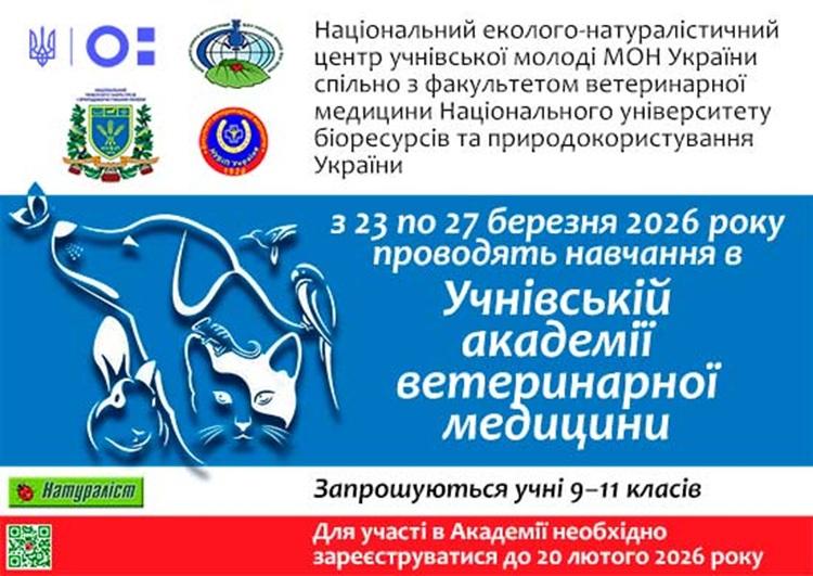 Національний еколого-натуралістичний центр учнівської молоді МОН України спільно з факультетом ветеринарної медицини Національного університету біоресурсів і природокористування України запрошують учнів до участі в навчанні в Учнівській академії ветеринарної медицини, яке відбудеться з 23 по 27 березня 2026 року.