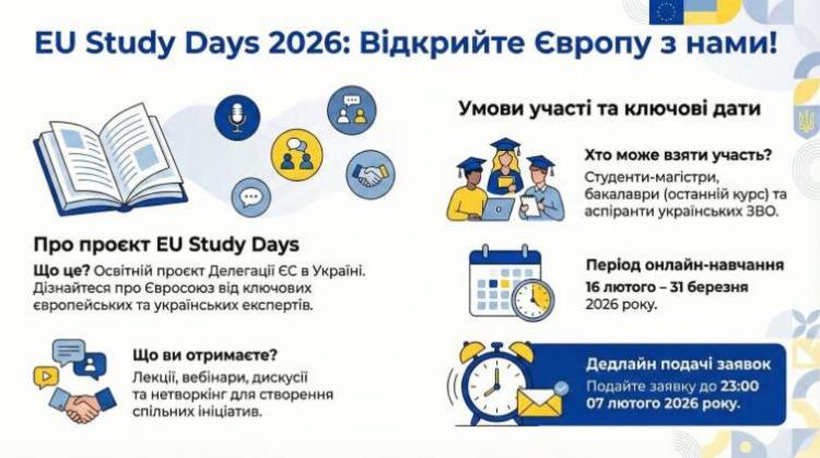 Онлайн-курси EU Study Days будуть відбуватися з 16 лютого по 31 березня 2026 року.