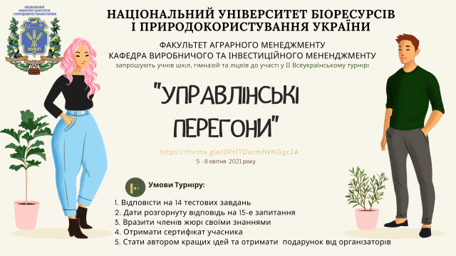 Кафедра виробничого та інвестиційного менеджменту факультету аграрного менеджменту Національного університету біоресурсів і природокористування України запрошує учнів навчальних закладів взяти участь у ІІ Всеукраїнському турнірі «Управлінські перегони», що проводитиметься 5 - 8 квітня 2021 року в дистанційному режимі за посиланням