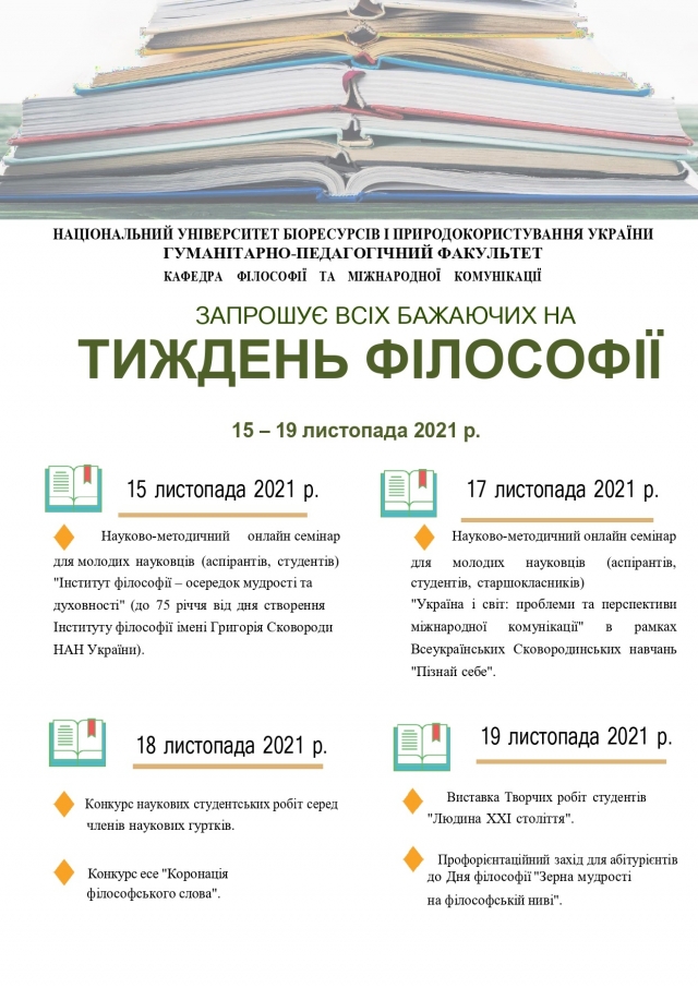 Запрошуємо до участі у тижні філософії (15-19 листопада 2021 р.) Програма тижня філософії 15 листопада 2021 року 02:00 - 02:00