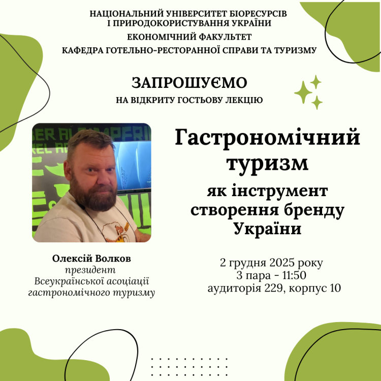 2 грудня 2025 року об 11.50 на кафедрі готельно-ресторанної справи та туризму відбудеться гостьова лекція з Олексієм Волковим – президентом Всеукраїнської асоціації гастрономічного туризму.