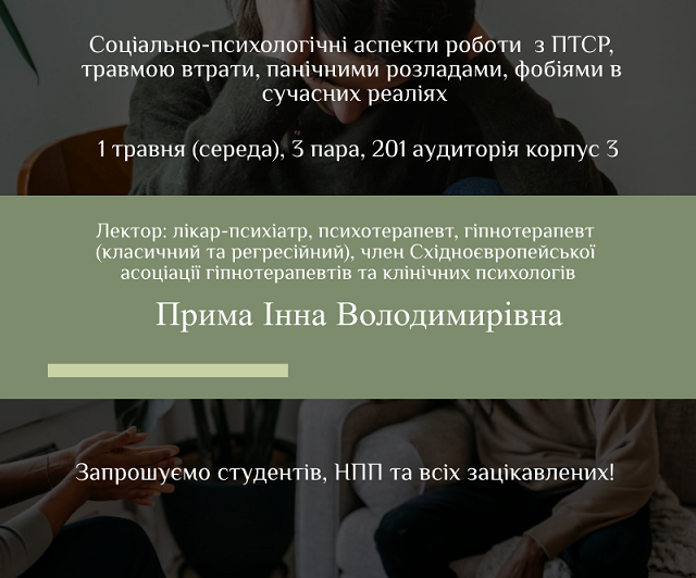 Запрошуємо на гостьову лекцію "Соціально-психологічні аспекти роботи з ПТСР, травмою втрати, панічними розладами, фобіями в сучасних реаліях" 1 травня 2024 року 03:00 - 03:00