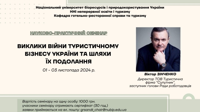 Запрошуємо зацікавлених осіб на науково-практичний семінар "Виклики війни туристичному бізнесу України та шляхи подолання" від Віктора Зінченко, директора ТОВ Туристична фірма"Супутник", заступника голови Ради роботодавців кафедри готельно-ресторанної справи та туризму НУБіП України. Семінар відбудеться 1-3 листопада 2024 р. у онлайн-форматі.