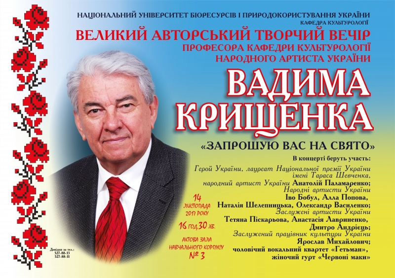 Запрошуємо на творчий вечір народного артиста України, професора кафедри культурології Вадима Крищенка 14 листопада 2017 року 02:00 - 02:00
