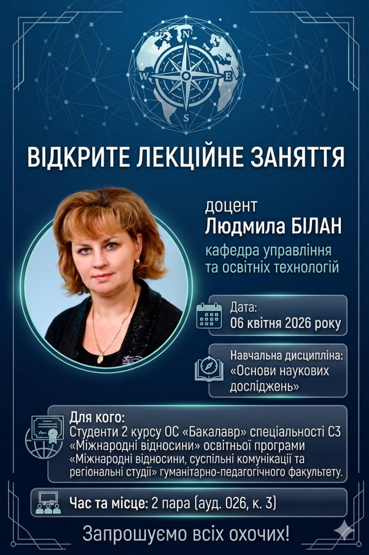 06 квітня 2026 року відбудеться відкрите лекційне заняття доцента кафедри управління та освітніх технологій Білан Л.Л. з навчальної дисципліни «Основи наукових досліджень» для студентів 2 курсу ОС «Бакалавр» спеціальності С3 «Міжнародні відносини» освітньої програми «Міжнародні відносини, суспільні комунікації та регіональні студії» гуманітарно-педагогічного факультету.