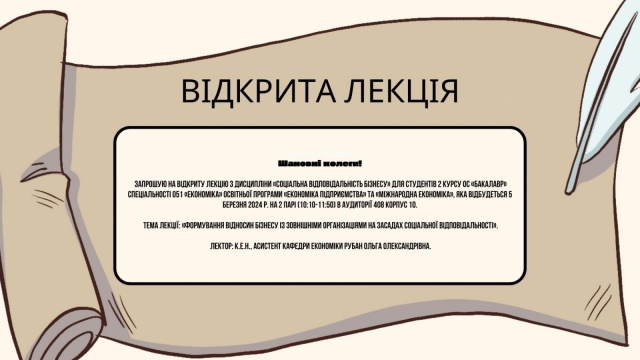 Шановні колеги! Запрошую на відкриту лекцію з дисципліни «Соціальна відповідальність бізнесу» для студентів 2 курсу ОС «Бакалавр» спеціальності 051 «Економіка» освітньої програми «Економіка підприємства» та «Міжнародна економіка», яка відбудеться 5 березня 2024 р. на 2 парі (10:10-11:50) в аудиторії 408 корпус 10. Тема лекції: «Формування відносин бізнесу із зовнішніми організаціями на засадах соціальної відповідальності».