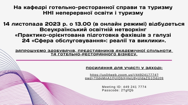 На кафедрі готельно-ресторанної справи та туризму ННІ неперервної освіти і туризму 14 листопада 2023 р. о 13.00 (в онлайн режимі) відбудеться Всеукраїнський освітній нетворкінг «Практико-орієнтована підготовка фахівців з галузі 24 «Сфера обслуговування»: реалії та виклики».
