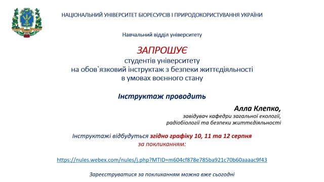Запрошуємо студентів на обов'язковий інструктаж з безпеки життєдіяльності https://nules.webex.com/nules/j.php?MTID=m604cf878e785ba921c70b60aaaac9f43 9 серпня 2022 року 03:00 - 03:00