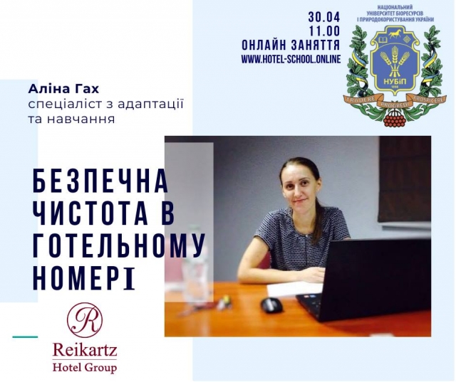 Запрошуємо Вас на онлайн заняття на тему: "Безпечна чистота в готельному номері", яку проведе Аліна Гах, спеціаліст з адаптації та навчання мережі Reikartz Hotel Group. Заняття відбудеться 30 квітня 2020 року в 11.00.
