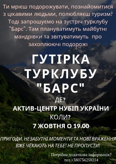 Запрошуємо студентів 1 курсу спеціальностей "Туризм" і "Готельно-ресторанна справа" на презентацію туристичного клубу "Барс" Національного університету біоресурсів і природокористування України!