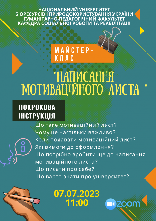 Запрошуємо Вас на безкоштовний майстер-клас із написання мотиваційного листа у п'ятницю 7 липня 2023 року об 11.00 в онлайн форматі.