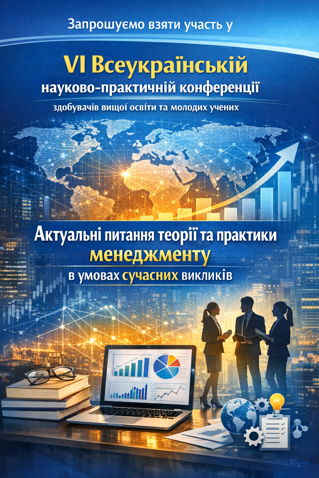 Запрошуємо взяти участь у VI Всеукраїнській науково-практичній конференції здобувачів вищої освіти та молодих учених «Актуальні питання теорії та практики менеджменту в умовах сучасних викликів».