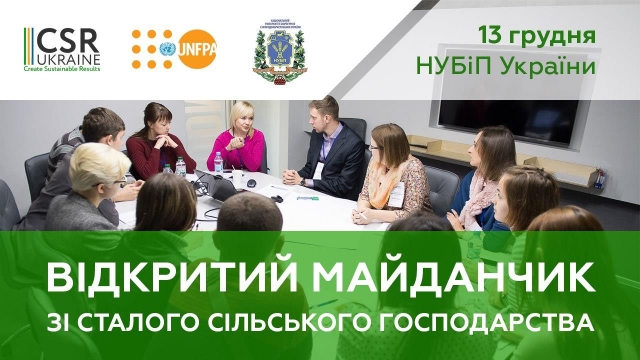 Експертна організація Центр "Розвиток КСВ", Фонд ООН у галузі народонаселення та Національний університет біоресурсів і природокористування України запрошують представників компаній, університетів, активну молодь та профільних експертів 13 грудня з 10:00 до 13:00 на зустріч "Відкритий майданчик зі сталого сільського господарства", що відбудеться за адресою: