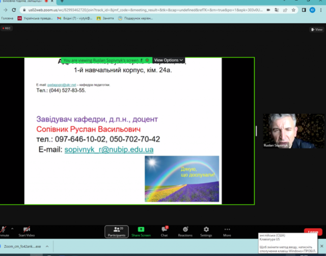 Попри воєнний стан і бойові дії, що точаться на південному сході нашої країни, тил має забезпечувати життєздатність українського суспільства. Кожен мусить виконувати своє призначення, здійснювати свій посильний вклад у державотворчі процеси, зміцнення обороноздатності країни, її економіки. Дуже важливо забезпечувати формування світогляду громадян, дбати про їх професійну підготовку, чим і займаються наш, Національний університет біоресурсів і природокористування України віти. У цьому напрямі продуктивно працює його кафедра педагогіки. У той же час, наші викладачі і десятки студентів сьогодні на передньому краю серед волонтерів, воїнів територіальної оборони, військовослужбовців ЗСУ звершують подвиг в ім’я миру і майбутнього країни.