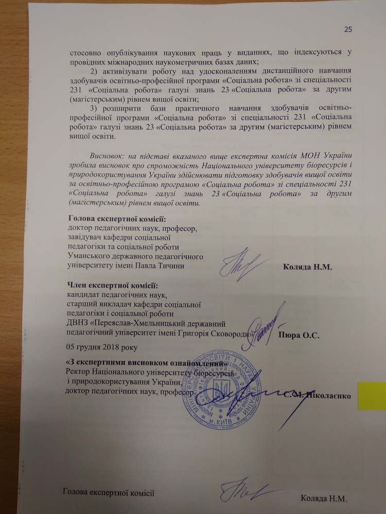 Експертна комісія Міністерства освіти і науки України зробила висновок про спроможність Національного університету біоресурсів і природокористування України здійснювати підготовку здобувачів вищої освіти за освітньо-професійною програмою «Соціальна робота» зі спеціальності 231 «Соціальна робота» за другим (магістерським) рівнем вищої освіти.