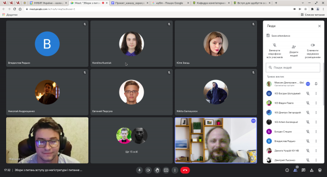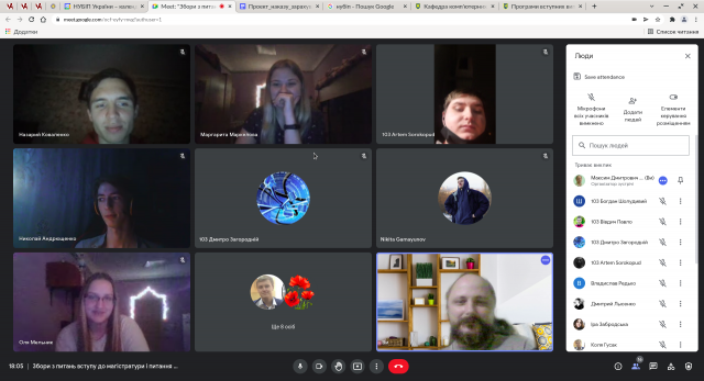 Студенти ставили різні питання, зокрема такі: ознайомлення з можливістю вступу до магістратури, можливість виходу на очні заняття, написання та оформлення дипломного бакалаврської кваліфікаційної роботи. До онлайн-зустрічі долучився завідувач кафедри комп'ютерних систем, мереж та кібербезпеки професор Валерій Лахно, а також студенти 2 року навчання у магістратурі Олександр Чорноус, Нікіта Гамаюнов, Владислав Редько.