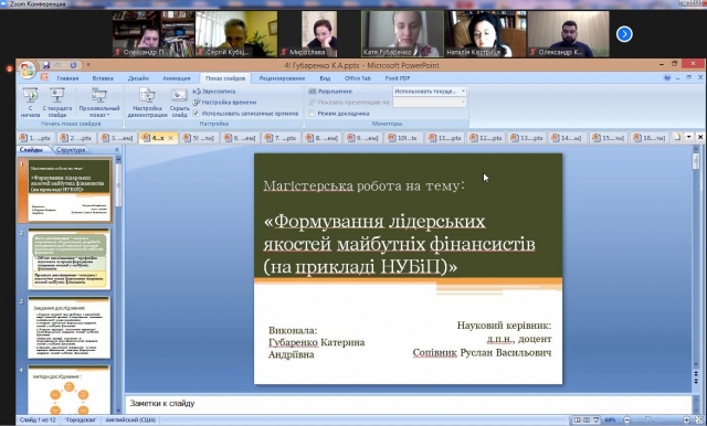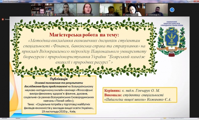 Однією із перших представила свою роботу Тетяна Бойко за темою «Методика виховання лідерських якостей студентів (на прикладі НУБіП України)», яка викликала неабиякий інтерес у комісії, члени якої поставили такі запитання: «Які лідерські якості варто розвивати у здобувачів вищої освіти?», «Яка база була використана під час проведення експерименту?» тощо.