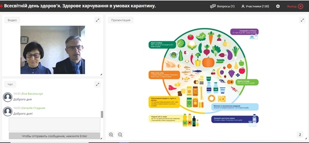 Всім відома користь простих фізичних вправ. А давайте спитаємо у себе: «Ми їх дотримуємось?» Більшість виправдовується відсутністю часу, завантаженістю тощо. А під час карантину? Невже не можна виділити 10-15 хвилин, щоб зміцнити своє здоров’я та показати позитивний приклад власним дітлахам? Корисними були рекомендації щодо зміни робочого положення під час сидячої роботи; встановлення таймеру; за можливістю прогулянки на свіжому повітрі за відсутності людей та ін. Нагадування про перекуси спонукало учасників згадати перший вебінар. Під час карантину особлива увага зверталась на підтримку чистоти у квартирі. Так, регулярне провітрювання, за дослідженнями вчених, знижує ризик захворювань, позитивно впливає на здоров’я нервової системи, самопочуття та працездатність. Також необхідно робити і вологе прибирання, фокусуючи його на тій поверхні, якої частіше торкаєтесь. І найголовніше під час карантину, щоб уникнути інформаційного перевантаження, необхідно користуватися джерелами Всесвітньої організації охорони здоров’я, Центру громадського здоров’я МОЗ України, оскільки вони надають лише достовірну інформацію. І як порада було запропоновано, як найкраще використання часу, читання художньої літератури, перегляд фільмів, спілкування з дітьми.