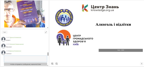 Останній, четвертий вебінар циклу "Алкоголь і підлітки" був присвячений профілактиці вживання підлітками слабоалкогольних напоїв та енергетиків. Так, було з’ясовано вплив алкоголю на психічний та фізичний розвиток дитини. Жвава дискусія розгорнулася навколо питання: «Чому люди п’ють?». А відповідь була проста: вживання алкоголю – це частина алкогольного культу. За даними WHO (2014 р.) наша держава є серед країн з найвищим рівнем споживання алкоголю у світі. Для молоді найбільшу загрозу становить саме напивання, як спонтанне вживання великої кількості алкоголю.