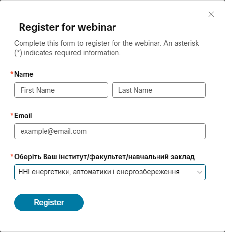 Для цього необхідно перейти за посиланням: https://nules.webex.com/nules/j.php?RGID=ra3a5974b62e8a605bc95d0128488e820 та натиснути «Зареєструватись (Register)»
