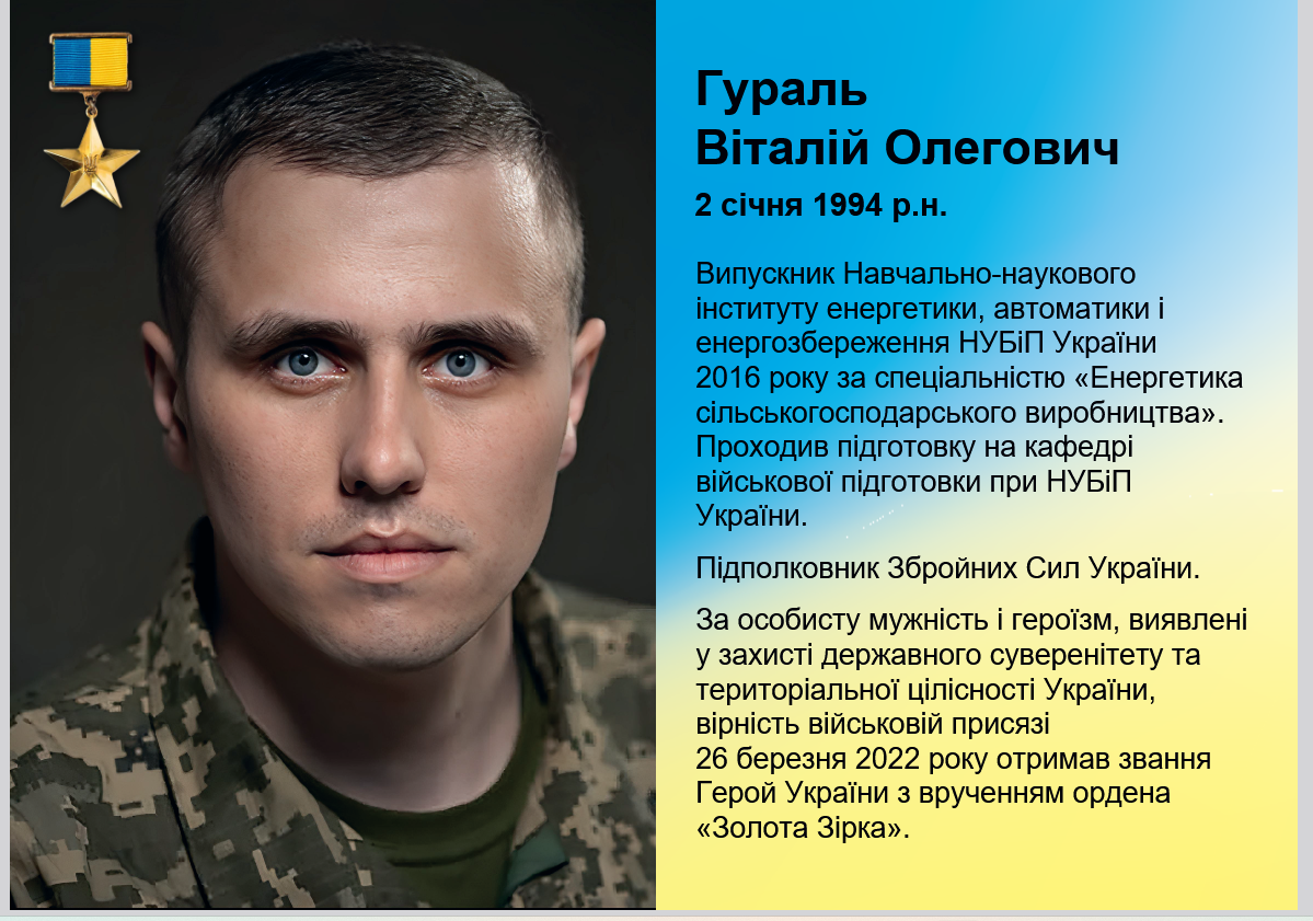 ГУРАЛЬ Віталій Олегович (нар. 2.01.1994 р., с. Шидлівці, Кам’янець-Подільський р-н, Хмельницька обл.). Випускник ННІ енергетики, автоматики і енергозбереження (2013–2016 рр.) та кафедри військової підготовки НУБіП України (2013–2015 рр.). З 2016 р. проходить військову службу у складі 58-ї окремої мотопіхотної бригади імені гетьмана Івана Виговського Сухопутних військ ЗСУ. У різні періоди обіймав такі посади: у 2018–2021 рр. – командир 1-ї мотопіхотної роти; у 2021–2022 рр. – начальник штабу, перший заступник командира 16-го окремого мотопіхотного батальйону; у 2022–2023 рр. – командир 2-го стрілецького батальйону; у 2023–2024 рр. – командир 16-го окремого мотопіхотного батальйону. Виконував бойові завдання у районі проведення антитерористичної операції та операції Об’єднаних сил на сході України. У подальший період особисто керував бойовими діями з метою недопущення просування противника на території Чернігівської області, здійснював планування та організацію вогневого ураження ворожих підрозділів. Надалі продовжував виконання бойових завдань на Луганському та Донецькому напрямках. Герой України (2024).