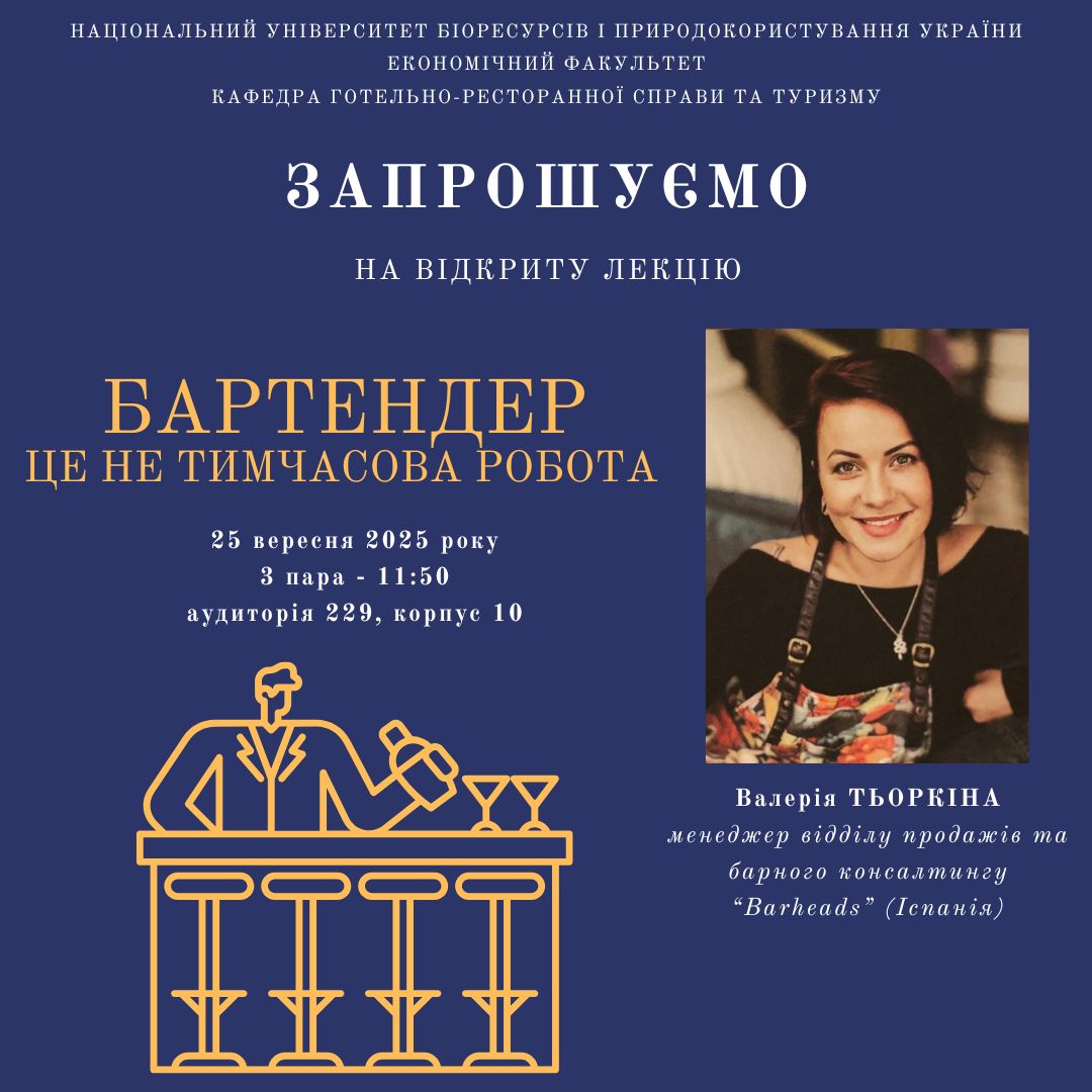 25 вересня відбудеться гостьова лекція менеджера відділу продажів та барного консалтингу "Barheads" (Іспанія) Валерії ТЕРКІНОЇ 25 вересня 2025 року 11:55 - 23:59